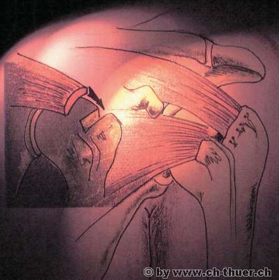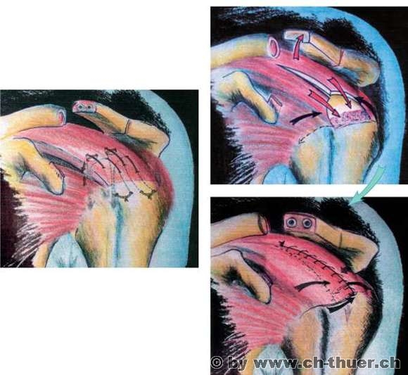 A cushioned abduction splint has to be worn to relieve the pain. When operating on the RC, I generally also "widen the roof" by enlarging the acromial angle (see section on lift-up osteotomies of the acromion).